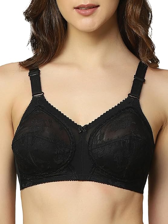 () Reviews(0) 1450Triumph Women's Black full-coverage lace bra, has non-wired and non-padded cups, elasticated and adjustable shoulder straps, hook-and-eye closures on the back.