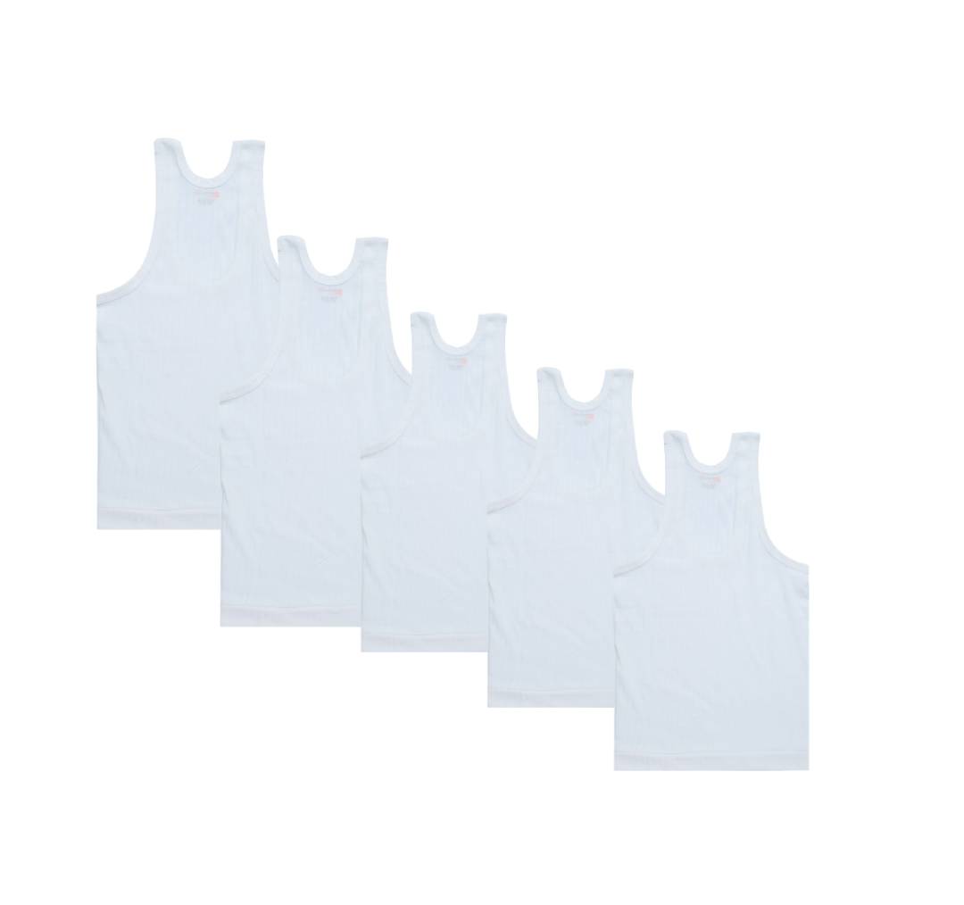 Pack of six white solid innerwear vests, each has a round neck, sleeveless